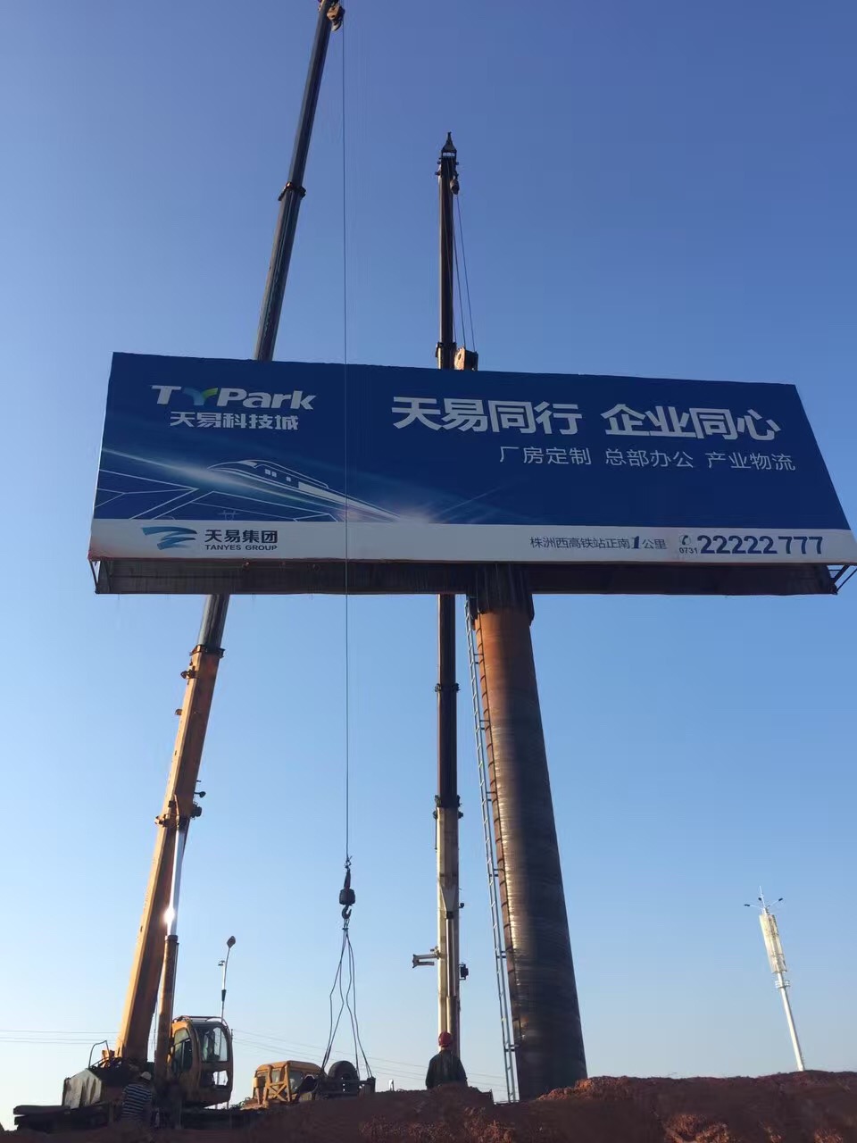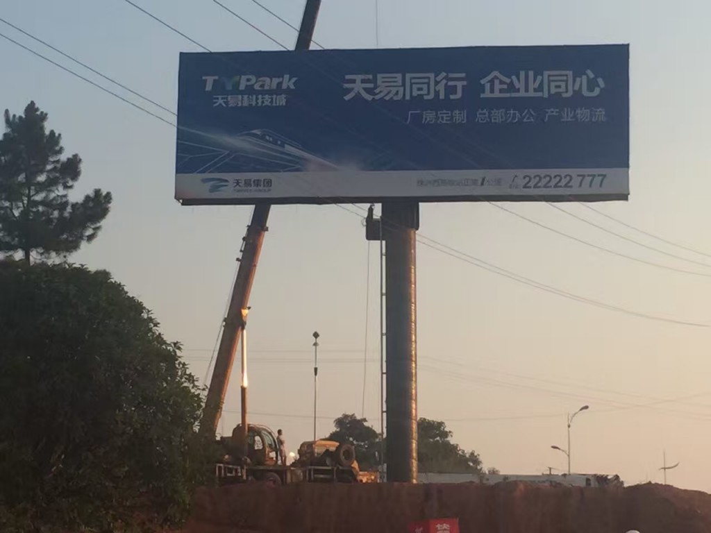 牌面為18mx6m的巨型廣告牌與高12米、直徑1.22m的螺旋管對接,如標(biāo)桿一般穩(wěn)穩(wěn)矗立在株洲天易武廣西站天易科技城。