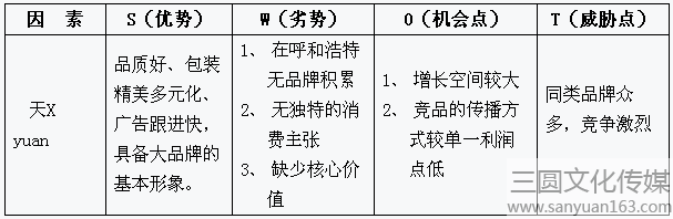 B、做市場不能缺少廣告,這也是各競品普遍的運(yùn)作手法,各競品單純的廣告轟炸在相互抵消其作用,讓消費(fèi)者在選擇上有了一定的難度,“天 X YUAN”具有自己的特色,溫馨的廣告詞,加入對家人的情感與現(xiàn)代生活的一個結(jié)合,很容易讓消費(fèi)者能夠接受。加以地面推進(jìn),力求短時(shí)間內(nèi)從眾多的競爭品牌中脫穎而出!