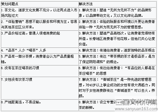 本次營(yíng)銷(xiāo)策劃是通過(guò)對(duì)長(zhǎng)春茶葉市場(chǎng)的調(diào)查,以及與長(zhǎng)春各家茶莊的比較分析,得出青城道專營(yíng)茶莊的優(yōu)勢(shì)和“青城道茶”的USP特點(diǎn),以及自身劣勢(shì)的回避方法。將“青城道茶”的優(yōu)勢(shì)和消費(fèi)者的接受程度作為廣告和營(yíng)銷(xiāo)的出發(fā)點(diǎn),針對(duì)劣勢(shì)進(jìn)行有效回避,同時(shí)對(duì)市場(chǎng)機(jī)會(huì)進(jìn)行有效應(yīng)對(duì)措施。