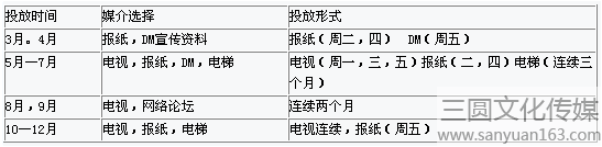 產(chǎn)品初進(jìn)市場(chǎng),消費(fèi)者不了解產(chǎn)品,需要電視打品牌,紙媒體說(shuō)服的策略,初步媒介定為,電視,報(bào)紙,電梯,網(wǎng)絡(luò)論壇,DM宣傳資料,路牌。有效保證了收視率和到達(dá)率的平衡。